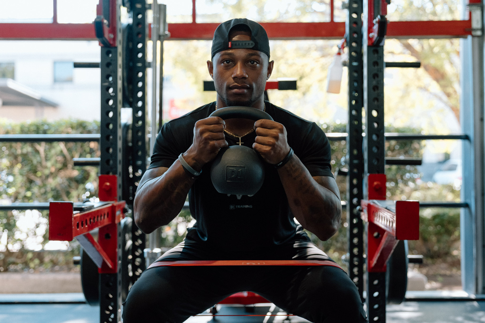 How: Loop a light-to-medium resistance band around your knees, holding a kettlebell close to your chest in the goblet position. As you squat down, push your knees slightly out against the band and drive through your heels to stand tall.